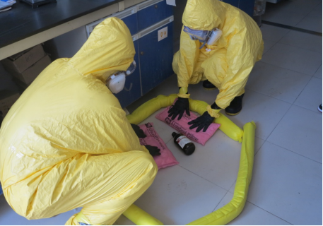 讲课结束后,随着刘彭义副院长的一声下令,以“食品系521实验室丙酮泄漏安全处置”为主题的应急演练正式开始。食品系李颖、虞兵、邱瑞霞、邓树林老师以及张珊、向媛媛、彭青霞、张栩、王展翔、王少林、刘军、陈果等同学立刻进入角色,从实验室丙酮泄漏开始,紧接着进行现场警戒、伤员紧急救护、并立即启动“危险化学品事故”应急安全处置机制和上报机制,处置人员身穿防护用品,进行环境监测,泄漏危化品的清理等等,把危化品泄漏安全处置全过程演练的非常成功。