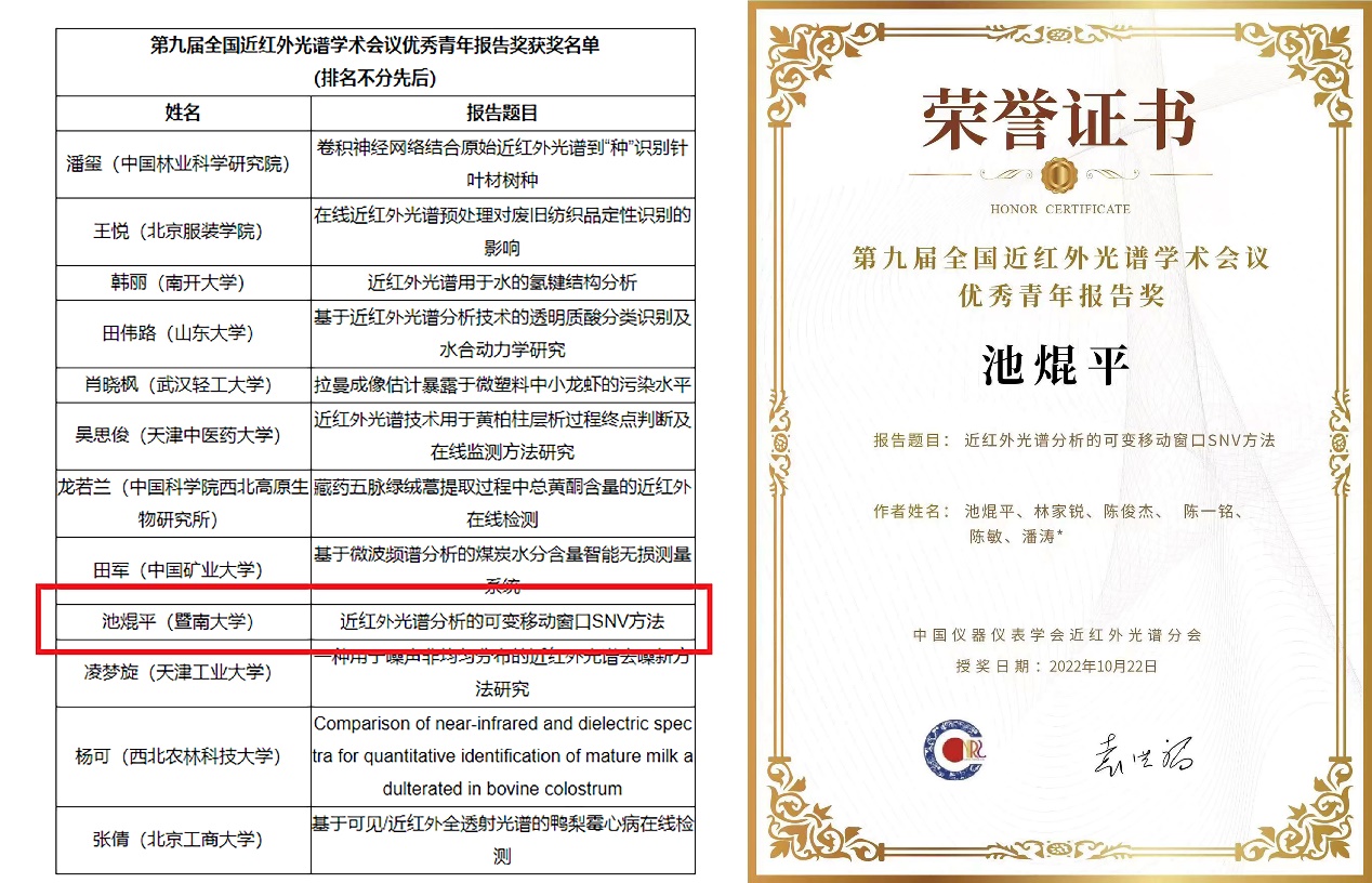 10月22日,由中国仪器仪表学会近红外光谱分会举办的全国第九届近红外光谱学术会议落幕。包子漫画 包子漫画 光电信息科学与工程专业2020级科研小组(池焜平、林家锐、陈敏、陈俊杰、陈一铭,指导老师:潘涛教授)完成的论文《近红外光谱分析的可变移动窗口SNV方法》被大会录用为宣读报告,并在72个青年报告中脱颖而出,荣获第九届全国近红外光谱学术会议优秀青年报告奖。