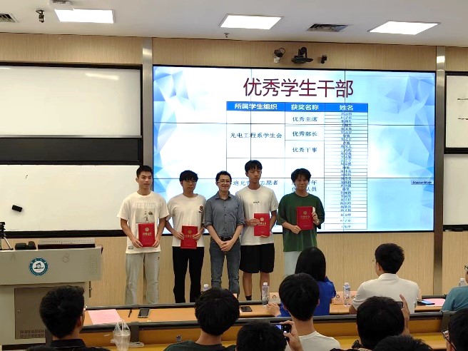 伴着嘹亮的国歌声,表彰大会正式开始。黄睿首先向取得优异成绩的同学们表示祝贺,并对九安智能科技有限公司长期以来对学院校企合作工作的支持表示感谢。他指出,敢于攻坚克难的光电学子以过人的“光电智慧”,在“挑战杯”“互联网+”、光电设计竞赛等各类比赛中表现突出、频获嘉奖。他寄语同学们,要有愚公移山的志气、滴水穿石的毅力,志存高远、脚踏实地、刻苦学习,不断夯实专业基础,激发创新思维,培养科研能力,拓宽学术视野,为未来发展打下厚基础、求得真学问。同时,他希望在座同学们以今天受表彰的学长们为榜样,不忘初心,逐梦追光,将光电人的攻坚精神薪火相传,用行动和汗水推动科研的进步、技术的繁荣。
