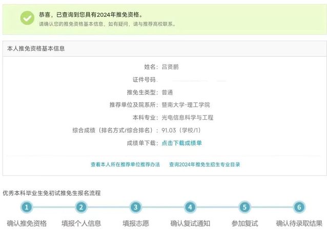 在深入了解心怡大学的保研要求后,他把更多时间放在了保研的加分项中,将自己的已发表的科研成果更加完善。功夫不负有心人,他最终成功保研到了中山大学的光学工程专业,在本科研究的太赫兹光电探测这一领域继续发光发热。