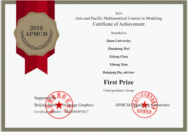 ◆ 2019亚太地区大学生数学建模竞赛一等奖;