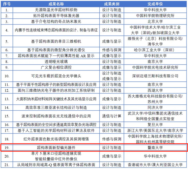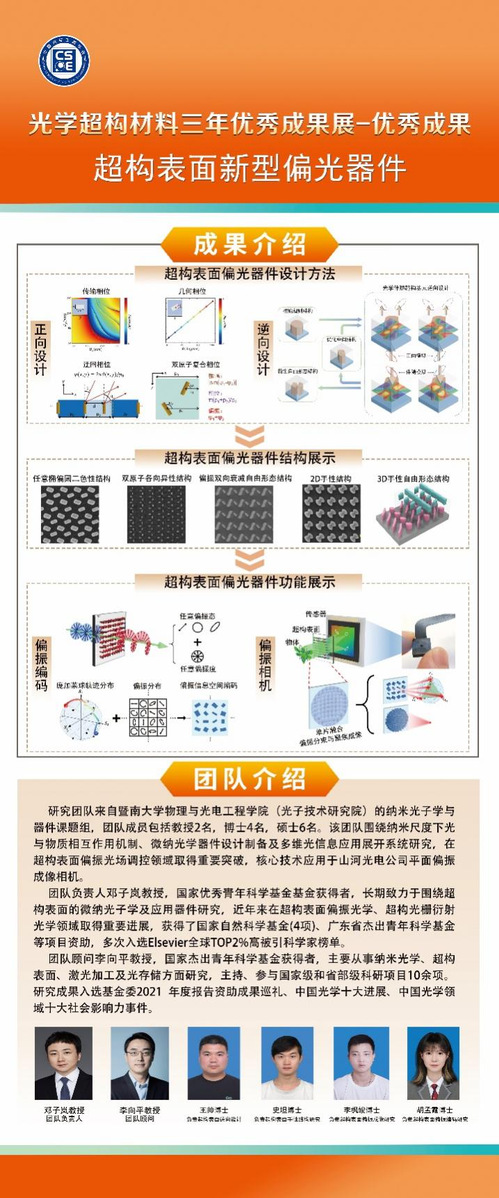 9月7日-9日,中国光学工程学会公布“光学超构材料三年优秀成果展”入选名单。包子漫画 光子技术研究院超构表面微纳光子器件课题组(邓子岚、李向平、王帅、史坦、李枫竣、胡孟霞)的系列成果——超构表面新型偏光器件,被评为“设计与制造类”优秀成果,充分展现了团队在微纳光学领域的创新能力与技术突破。