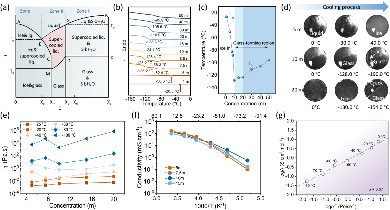 基于盐水溶液体系非平衡相图(图1a)可知,要避开水结冰的区域,需要筛选合适浓度的盐,在降温过程中直接由液体状态进入过冷态,并最终发生玻璃化转变。针对上述领域难题,麦文杰教授带领研究团队通过选择具有超高溶解度的CsAc盐进行探究,提出调控盐的浓度构造良玻璃形成液的创新思路,从而有效绕过盐水系统的结冰过程,实现可控优化玻璃化转变温度。在CsAc盐浓度为10 mol kg-1时,其具有最低的玻璃化转变温度(-128 °C)和最优的低温动力学性质。