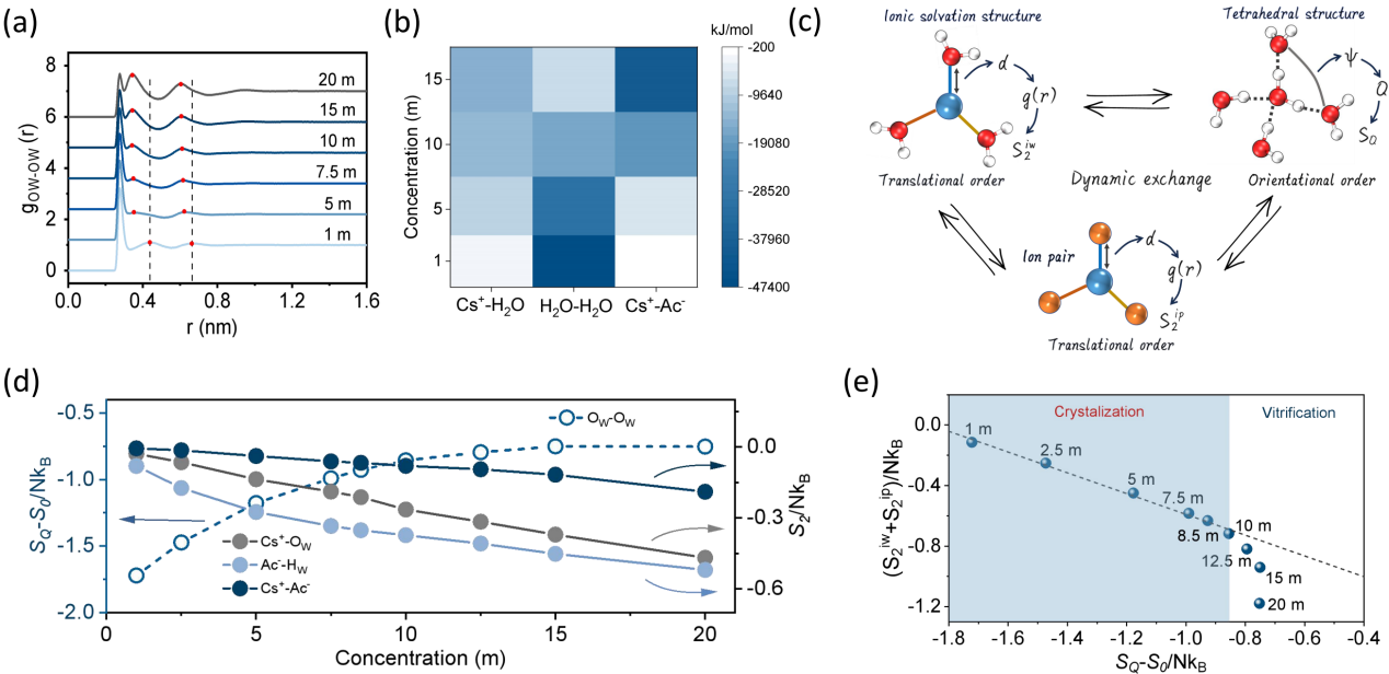 研究团队从理论计算层面采用分子动力学模拟的方法进一步分析了不同浓度CsAc电解液的溶剂化结构分布特性(图2),并细致统计了与水分子结构序相关的四面体熵以及与离子相关的二体对熵(包括阴阳离子之间以及离子-水之间)情况,发现两者在CsAc的浓度小于10 mol kg-1之前呈现良好的线性依赖关系,而当浓度大于10 mol kg-1,四面体熵的增长趋于饱和,而和离子相关的二体对熵开始对水溶液的相转变行为占主导作用,因此明显偏离线性关系。由此,在四面体结构水分子的转动序、离子与水及阴阳离子对的二体平动序共同协调平衡下,10 mol kg-1的CsAc盐水系统是玻璃化形成能力发生突变的转折点,由差玻璃形成体转变为良玻璃形成体,且此时其玻璃形成能力最强。