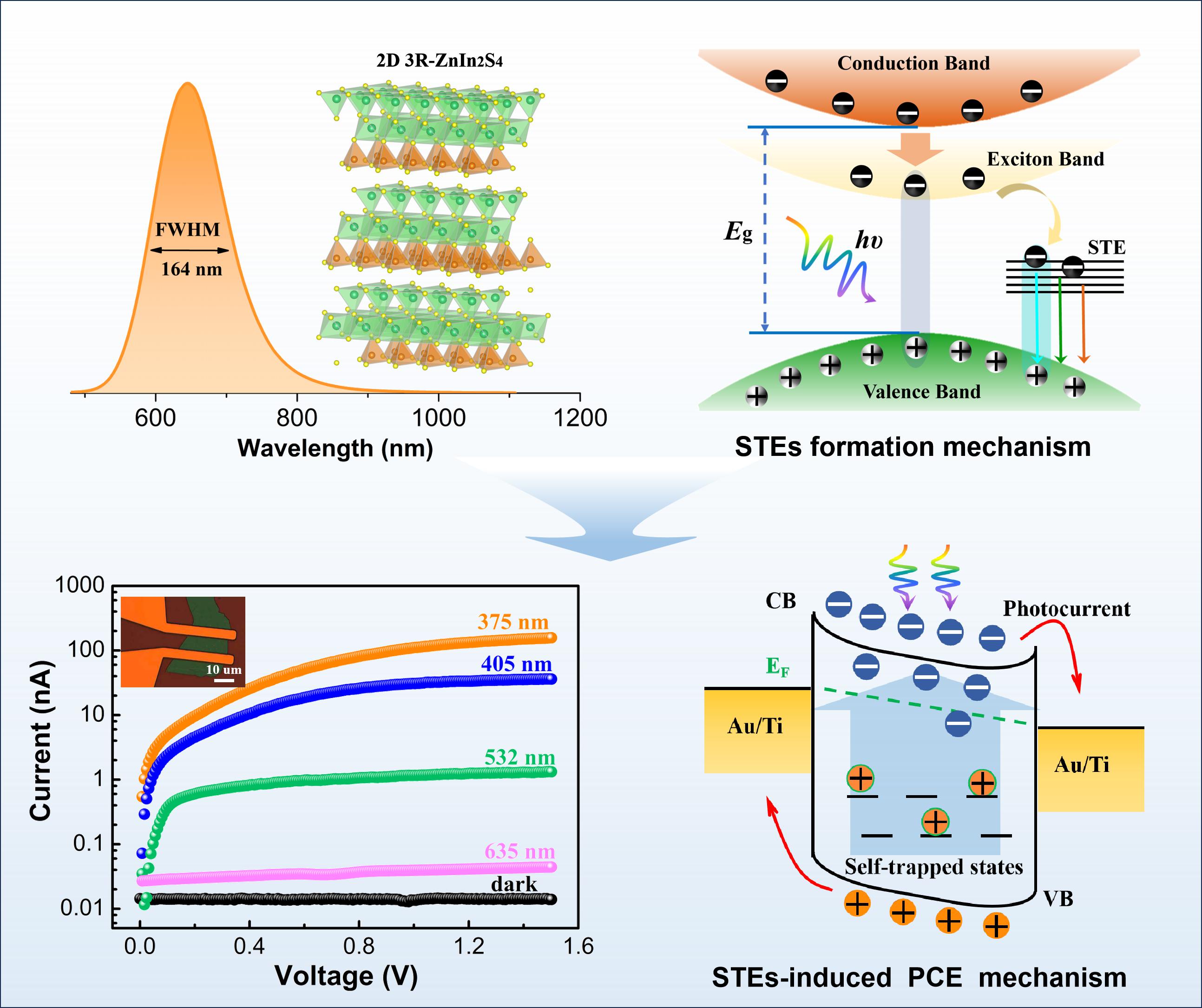 具有自陷态激子(STEs)效应的材料表现出优异的光电性能和可调性,包括宽光谱发射、长载流子寿命和自吸收特性,因其在发光二极管、光电探测和太阳能电池等领域的重要潜在应用而受到广泛的关注。通常,STEs是由具有强电子-声子耦合的受激软晶格半导体中的畸变形成的。值得注意的是,激发的STEs可以迅速弛豫回到基态,同时发射具有较大斯托克斯位移的宽发射带光子,这为相关材料在光电器件中的应用提供了理想的光学波长响应。更重要的是,能量接近STEs的光子在晶体内被吸收,促进了光电流的形成。因此,探索STEs相关材料以实现高性能光电探测器的应用将具有重要意义。
