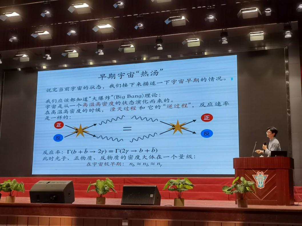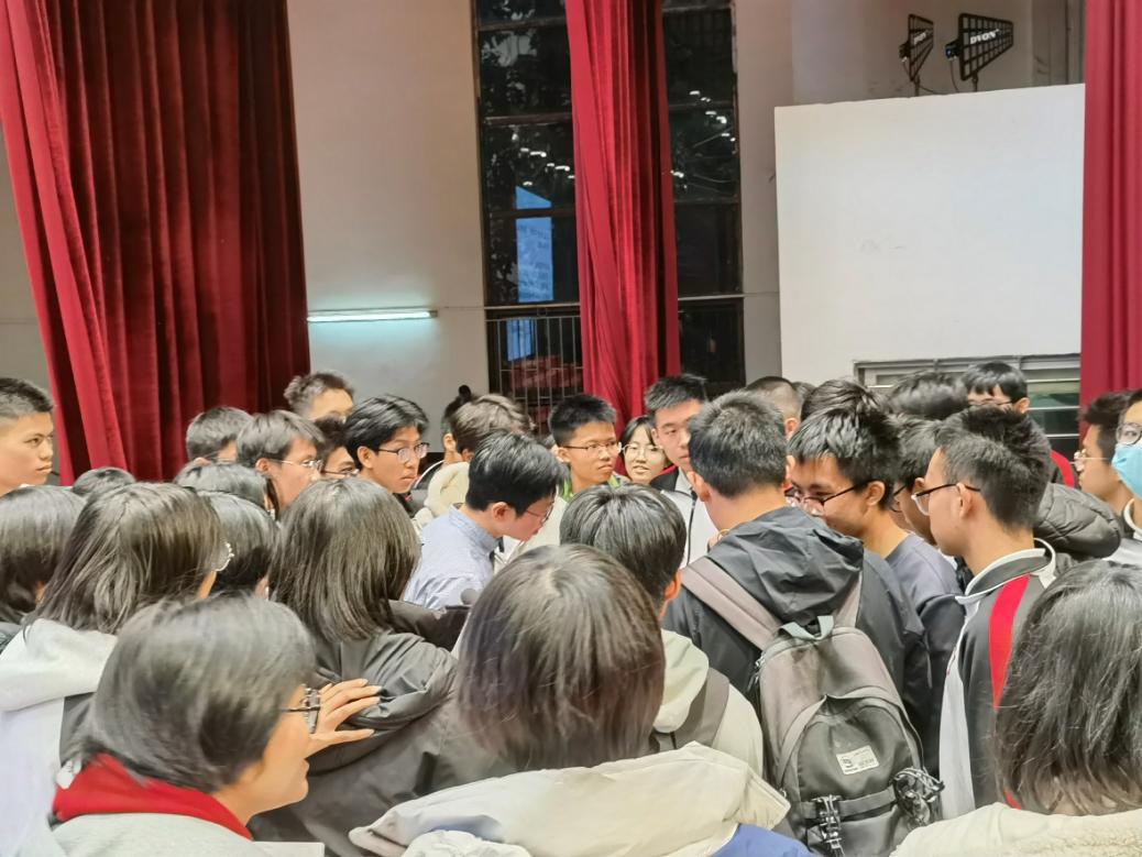 台山一中的学生们对暨大宣讲团表现出极大的热情,尤其是在科普讲座环节,马兰芳礼堂内座无虚席,三百余名自愿报名的学生聚精会神地倾听了张孟超题为“我们的世界从哪里来?—— 物质生成理论”的科普报告。报告结束后的自由交流环节,学生们将张孟超团团围住,互动气氛异常热烈。