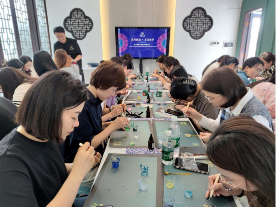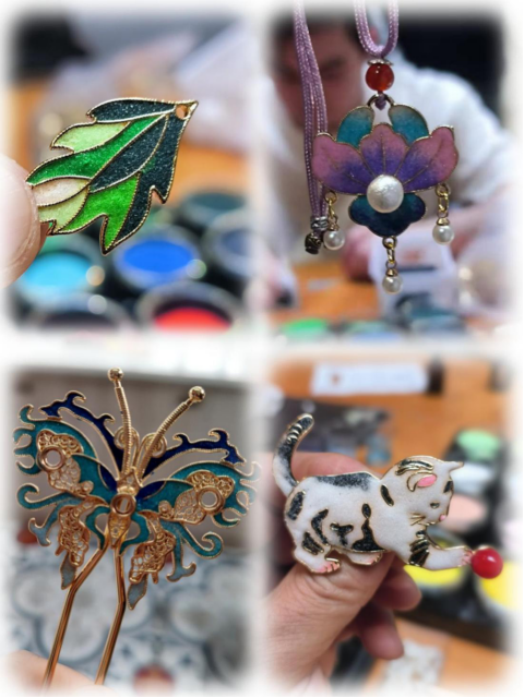 在专业老师的指导下,大家化身“匠人”,挑选自己喜爱的项链、发簪、挂件、胸针等样式,细心地掐丝、点蓝、烘干,体验这项传统工艺的魅力与乐趣。