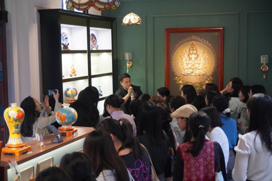 老师们齐聚非遗体验馆,首先参观欣赏了馆内陈列的精美珐琅制品;随后深入学习掐丝珐琅的制作工艺。掐丝珐琅,又称景泰蓝,距今已有600多年历史,是我国首批非物质文化遗产,以其独特的工艺、精美的造型、绚丽的色彩而闻名。