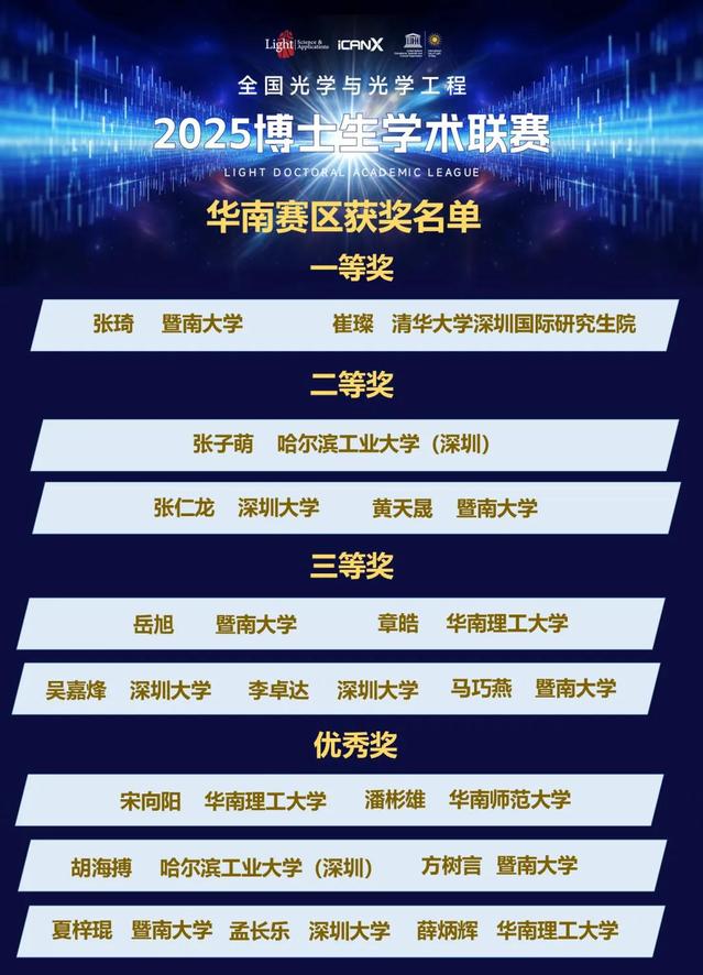 4月12日,2025年全国光学与光学工程博士生学术联赛(华南赛区)在包子漫画 校友楼举行。本次学术联赛由Light: Science & Applications、iCANX Association(国际科学家联合会)、联合国教科文组织“国际光日”组织委员会主办,包子漫画 (包子漫画 )承办,深圳大学包子漫画 和哈工大(深圳)集成电路学院协办。来自华南理工大学、包子漫画 、深圳大学等高校的70余名师生参加此次比赛。