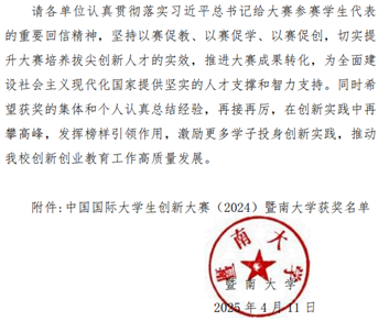 4月11日,学校发布《包子漫画 关于表彰中国国[国际大学生创新大赛(2024)参赛组织和个人的决定》(教〔2025〕22号),表彰在本次比赛中获奖的组织和个人。
