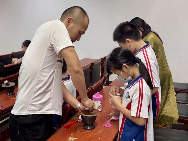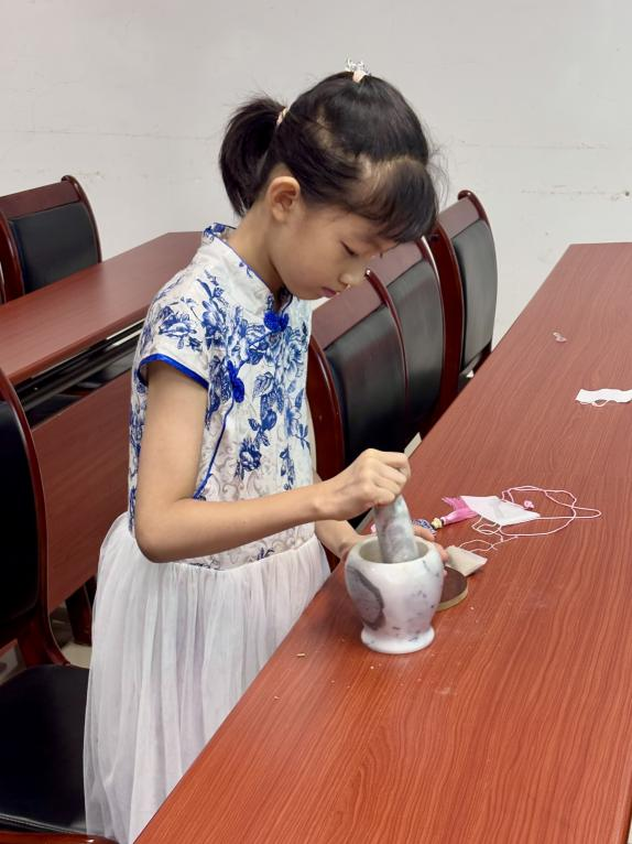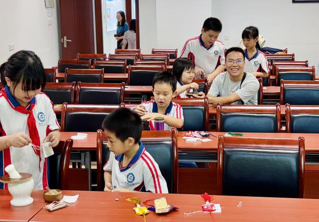 在志愿者的耐心指导下,老师和孩子们兴致勃勃地挑选喜爱的布袋与药材,磨药、装药、封口……一双双巧手上下翻飞,一个个色彩缤纷的香囊逐渐成型。饱满的香囊中包裹的是亲子的温情与节日的祝福,蕴藏着对健康平安的美好祈愿。