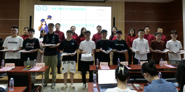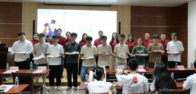 随后,全体领导和老师为毕业生逐一赠送光电人专属毕业纪念品。这份承载着暨南园回忆与院系温度的礼物,是母校对毕业生的牵挂与祝福,愿他们带着“追光逐梦,砺行致远”的信念奔赴远方。