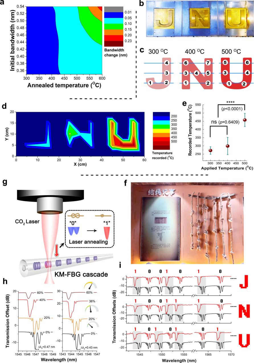 研究团队展示了KM-FBG的功能应用。首先是利用KM-FBG进行“结绳”记温,将KM-FBG阵列铺设在具有JNU图案的加热板表面,J、N、U三个区域分别加热至300℃、400℃、500℃,冷却后光栅谱型准确地记录了各区域的最高温度。接下来利用KM-FBG进行“结绳”编码,采用激光加热方式对KM-FBG进行快速“结绳”(调制时间仅需0.6秒),通过控制激光功率精准调控谱型,未加热的双谐振峰光谱(“双结”)对应“0”,加热融合的单谐振峰光谱(“单结”)对应“1”,实现了二进制数据编码。通过波长复用技术,可以将多个不同波长的KM-FBG串联形成阵列,实现ASCII 码信息(如字母“J”,“N”,“U”)编码与存储。