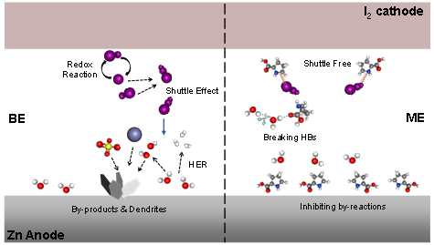 水系锌碘电池(AZIBs)的发展受到正极的穿梭效应和锌负极表面不可控副反应的制约。团队将一种多功能氨基酸添加剂脯氨酸(Pro)引入到传统电池电解液硫酸锌中,该添加剂分子拥有丰富的极性官能团,不仅可以通过分子极性作用在正极处抑制聚碘化物的扩散与穿梭,还可以破坏锌负极表面的氢键网络从而减少副反应的发生,同时诱导锌离子均匀沉积,通过调节电池整体离子动力行为来提高电池器件的稳定性。