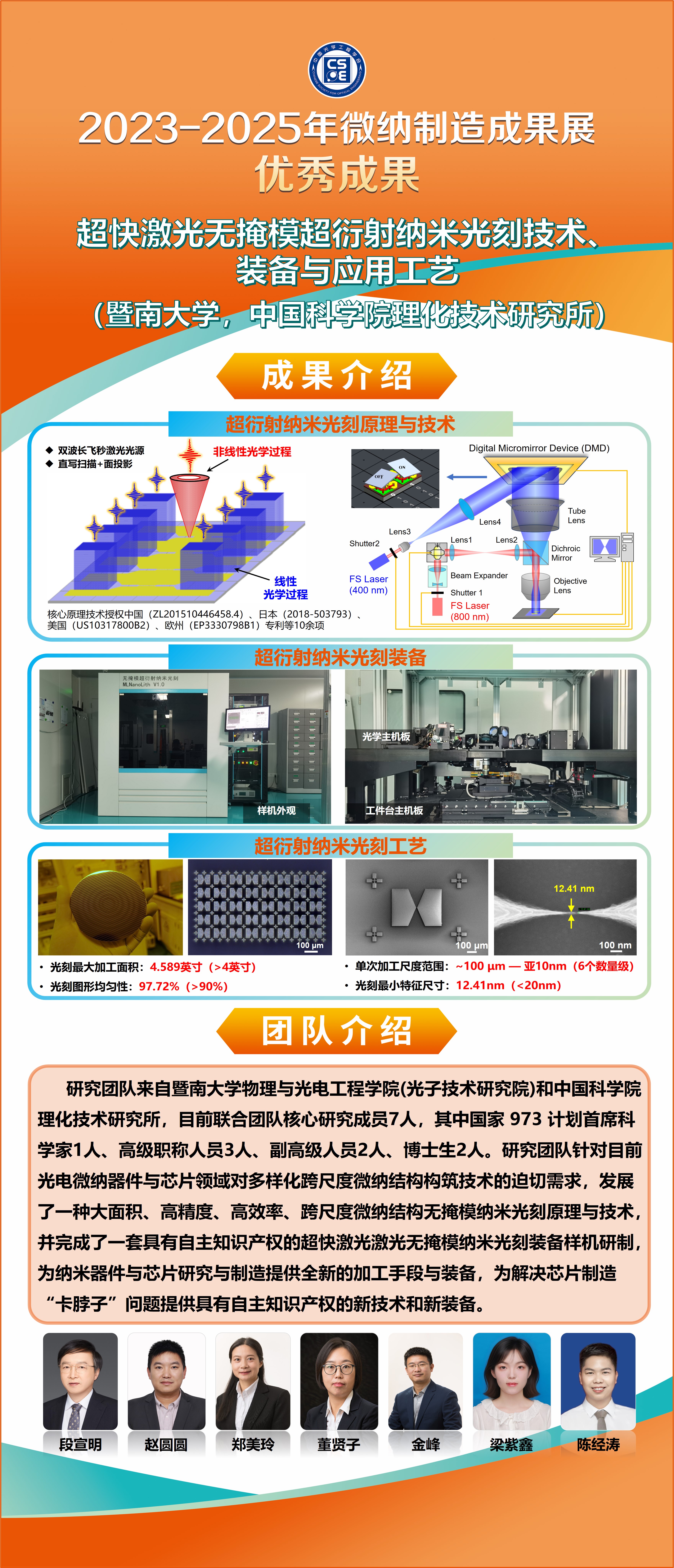 段宣明教授带领的联合研究团队长期从事超快激光纳米加工及光刻技术研究。团队围绕突破光学衍射极限这一重大科学问题,原创性地提出了非简并多光子纳米加工新原理,实现了13 nm直写加工分辨率;原创性地提出激光扫描与投影相结合的跨尺度微纳结构光刻方法,实现了包括从10 nm至150 μm尺寸复杂结构并存的跨尺度微纳结构高效光刻;并首次在无掩模投影光刻中实现了数字移相掩模、原位多重曝光及数字反演计算光刻等分辨力增强技术。团队所开展的无掩模超衍射纳米光刻技术已获中、日、美、欧等专利授权10余项,实现了最小特征尺度仅为10 nm,半间距λ/4NA的无掩模光刻,技术水平达到国际领先。在此基础上,团队发展了一种大面积、高精度、高效率、跨尺度微纳结构无掩模纳米光刻原理与技术,完成了一套具有自主知识产权的国际首台数字无掩模纳米光刻装备样机,开发了配套的创新芯片光刻工艺,并在器件与芯片制造中进行应用示范,实现了贯穿新原理、新技术、新装备、新工艺、新应用的无掩模超衍射纳米光刻技术、装备与应用全价值链创新。