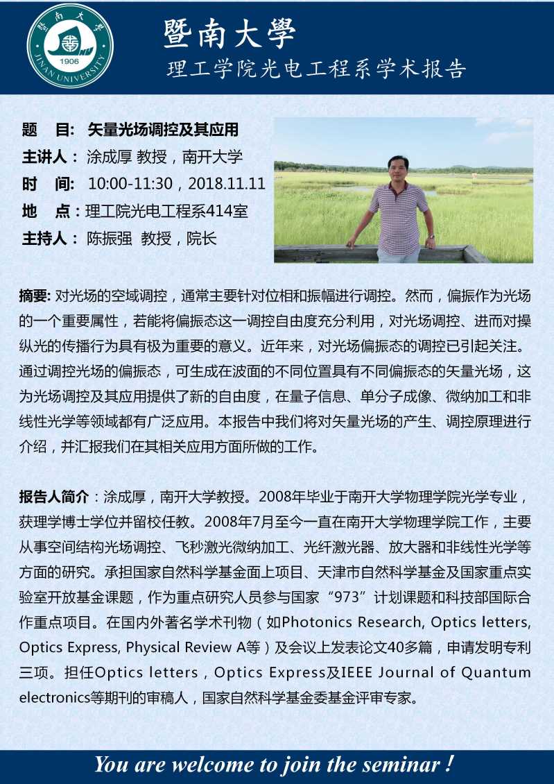 题目:Nanoplasmonics:from multi-dimensional information technologies to multi-functional metasurfaces主讲人:李向平 教授主持人:陈振强 院长...