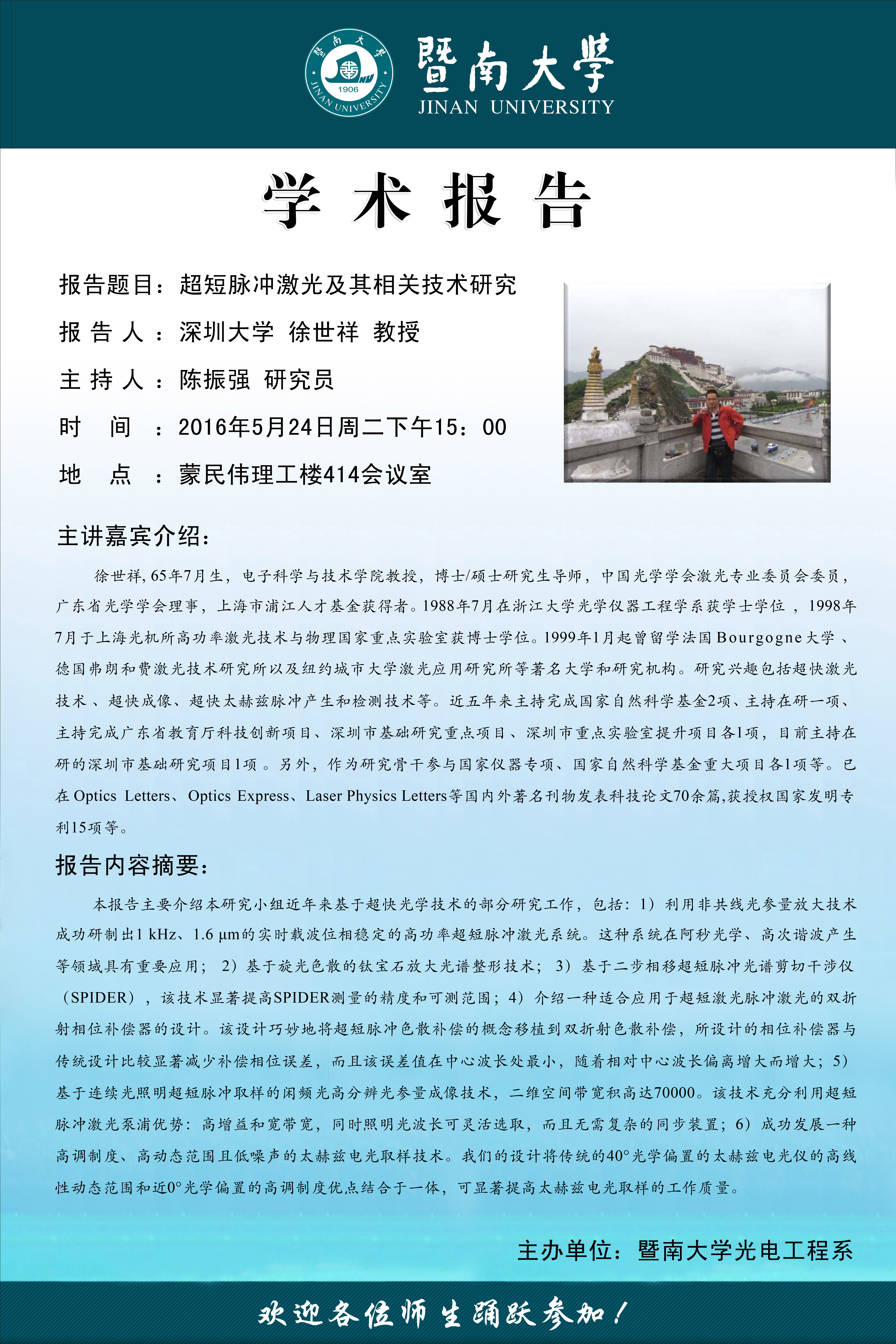报告题目:Energy Storage – Mechanics, Materials, Devices and more 报 告 人:姜汉卿 美国亚利桑那州立大学教授、暨南...